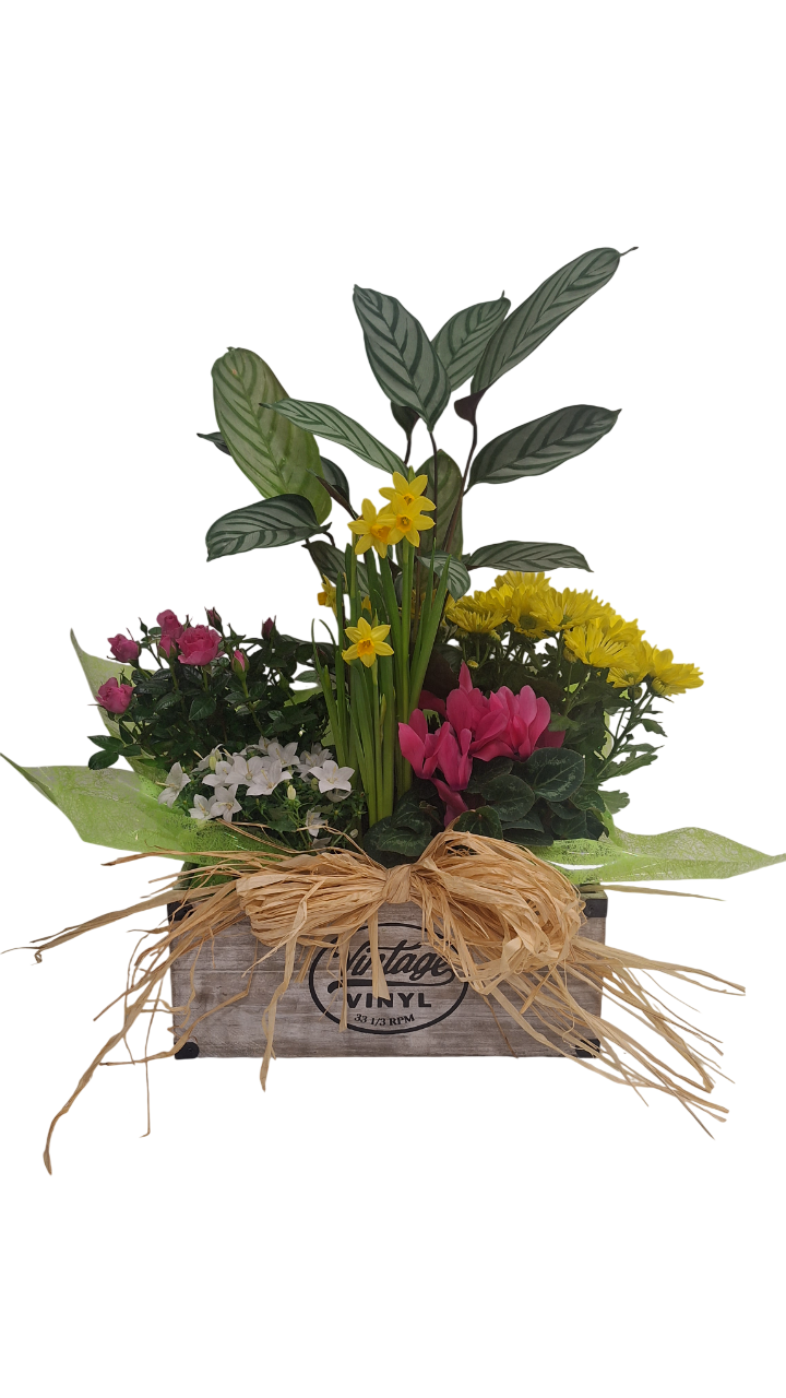 Estupendo regalo para cualquier ocasión, Vintage es un arreglo que combina plantas verdes y de flor a varias alturas con una combinación de colores muy alegre, montado en una caja de madera decorada. Un obsequio bonito y a la vez duradero. Las plantas van en sus propios maceteros, con lo que se pueden mantener en la cesta o separar y colocarlas en distinto lugares de la casa.
