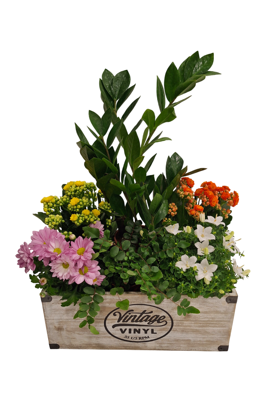 Estupendo regalo para cualquier ocasión, Vintage es un arreglo que combina plantas verdes y de flor a varias alturas con una combinación de colores muy alegre, montado en una caja de madera decorada. Un obsequio bonito y a la vez duradero. Las plantas van en sus propios maceteros, con lo que se pueden mantener en la cesta o separar y colocarlas en distinto lugares de la casa.
