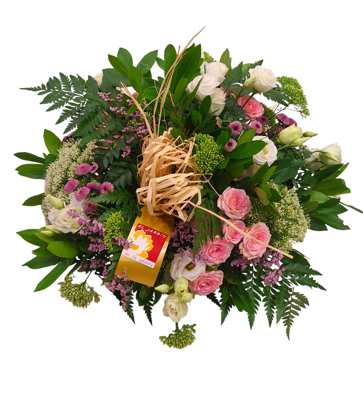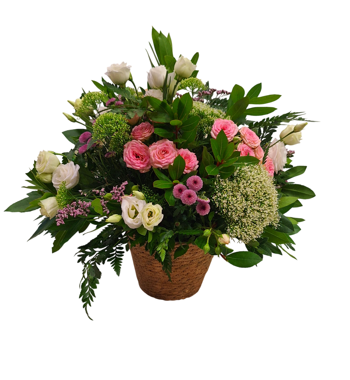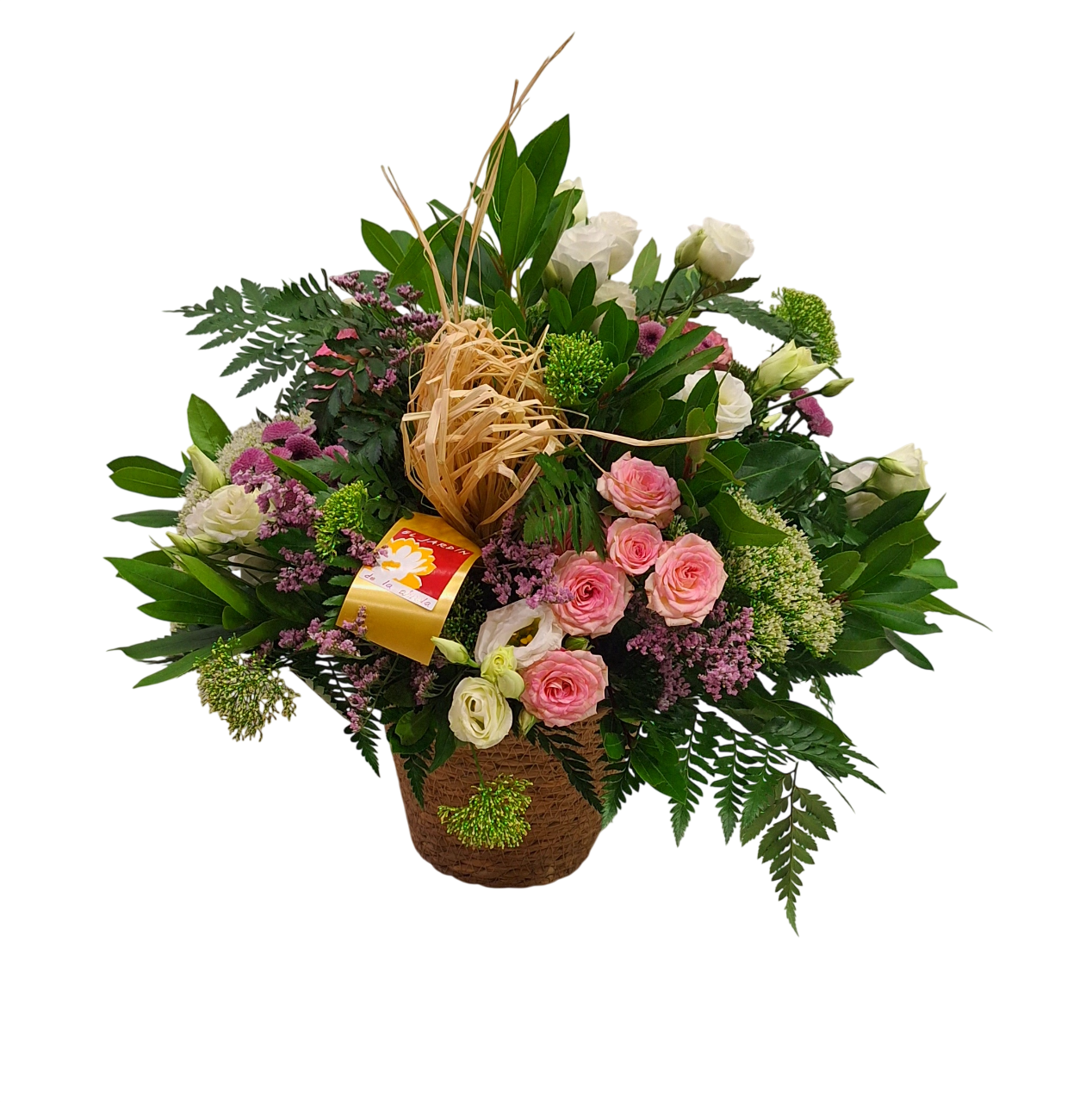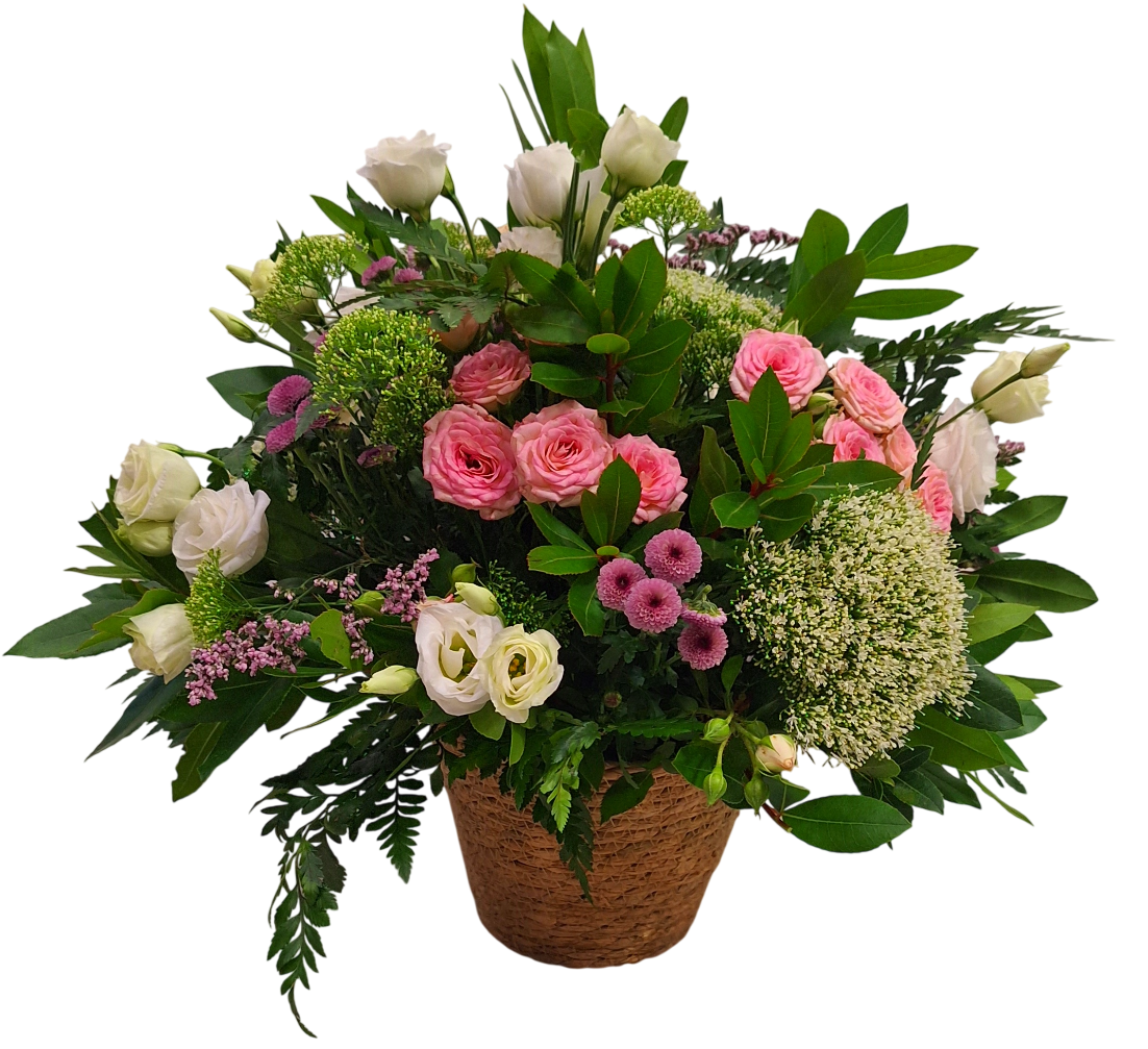 Bonito arreglo con flores en tonos blancos, cremas y rosas, diseñado con estilo libre, con profusión de verdes que aportan movimiento y utilizando rosas, alstroemerias, siemprevivas, …. Una composición desenfadada y fresca, montada sobre una base de mimbre o yute y adornado con detalle de rafia.