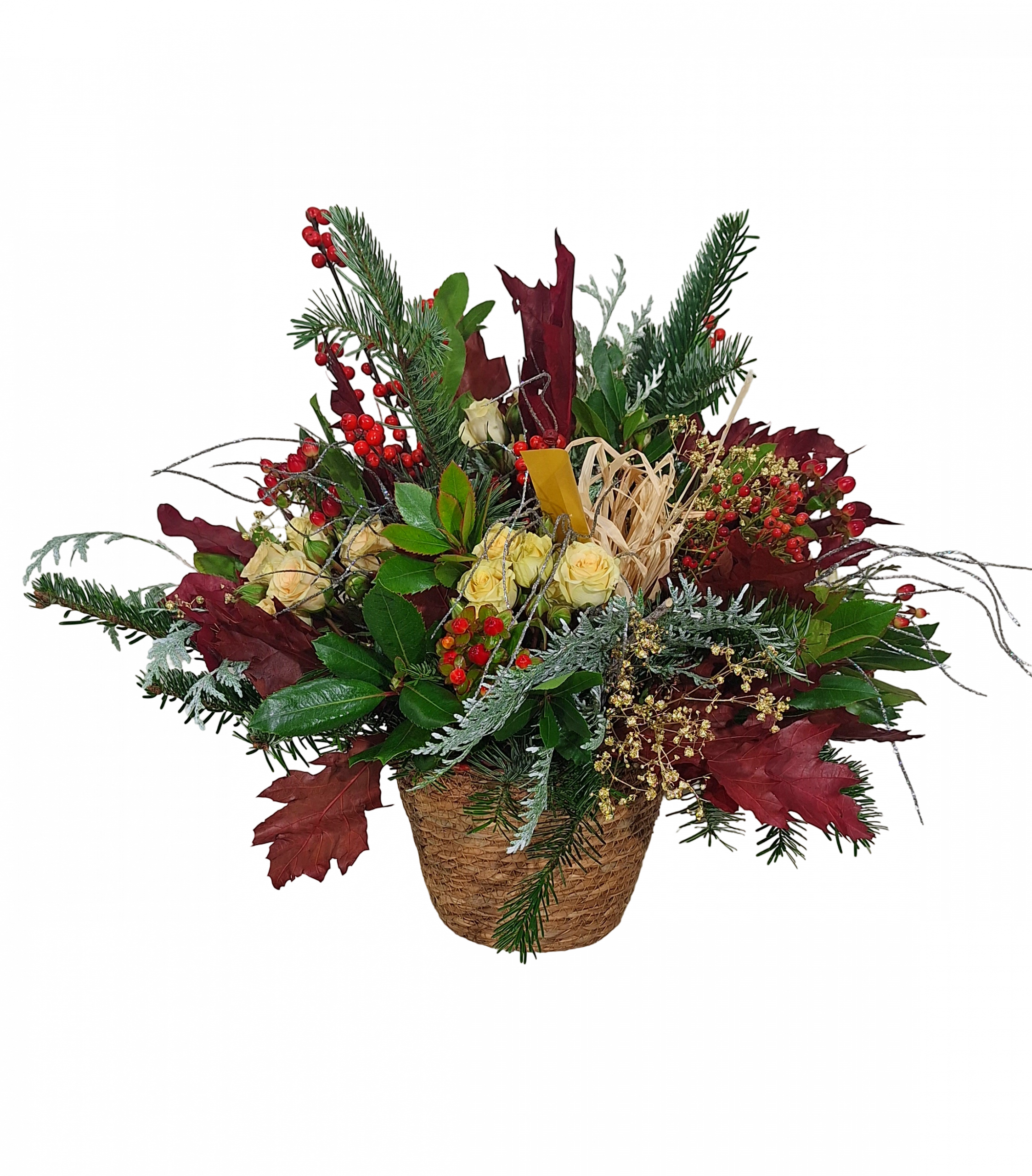 Precioso arreglo de flores navideñas con tonos rojos, dorados, granates, verdes y cremas, montado en un macetero de yute.