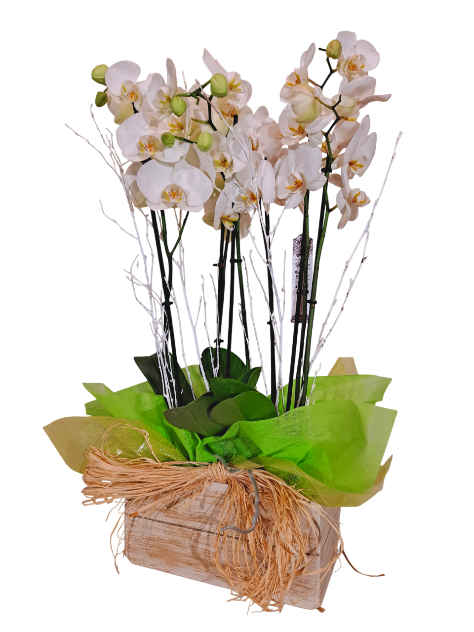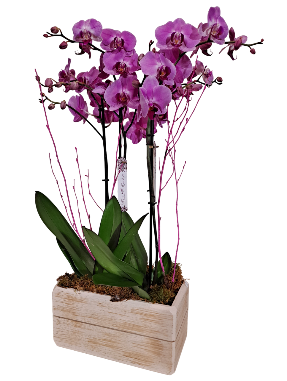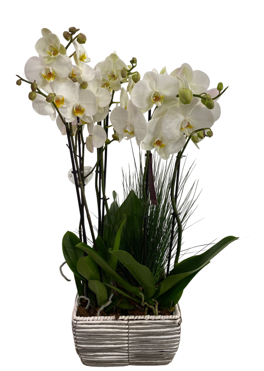 Elegante arreglo formado por dos orquídeas de dos o tres tallos cada una colocadas en caja rústica de madera o similar, complementado con musgo o corteza decorativa en la base, acompañado con papeles vegetales y lazo de rafia. Un precioso regalo para quedar muy bien.