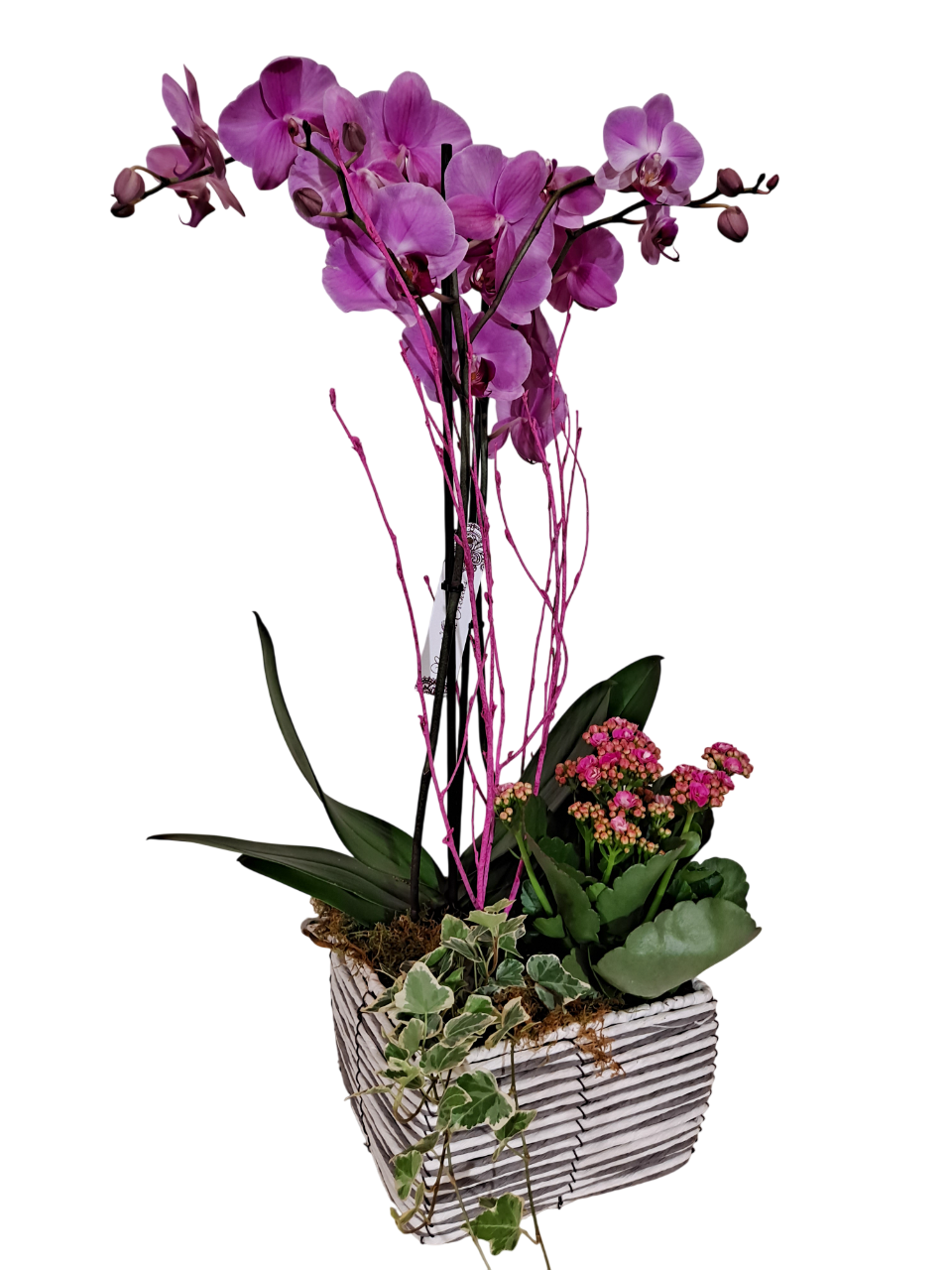 Elegante arreglo con planta de orquídea phalaenopsis sobre una cesta de raffia, complementado con un kalanchoe de flores y una plantita de hiedra.
