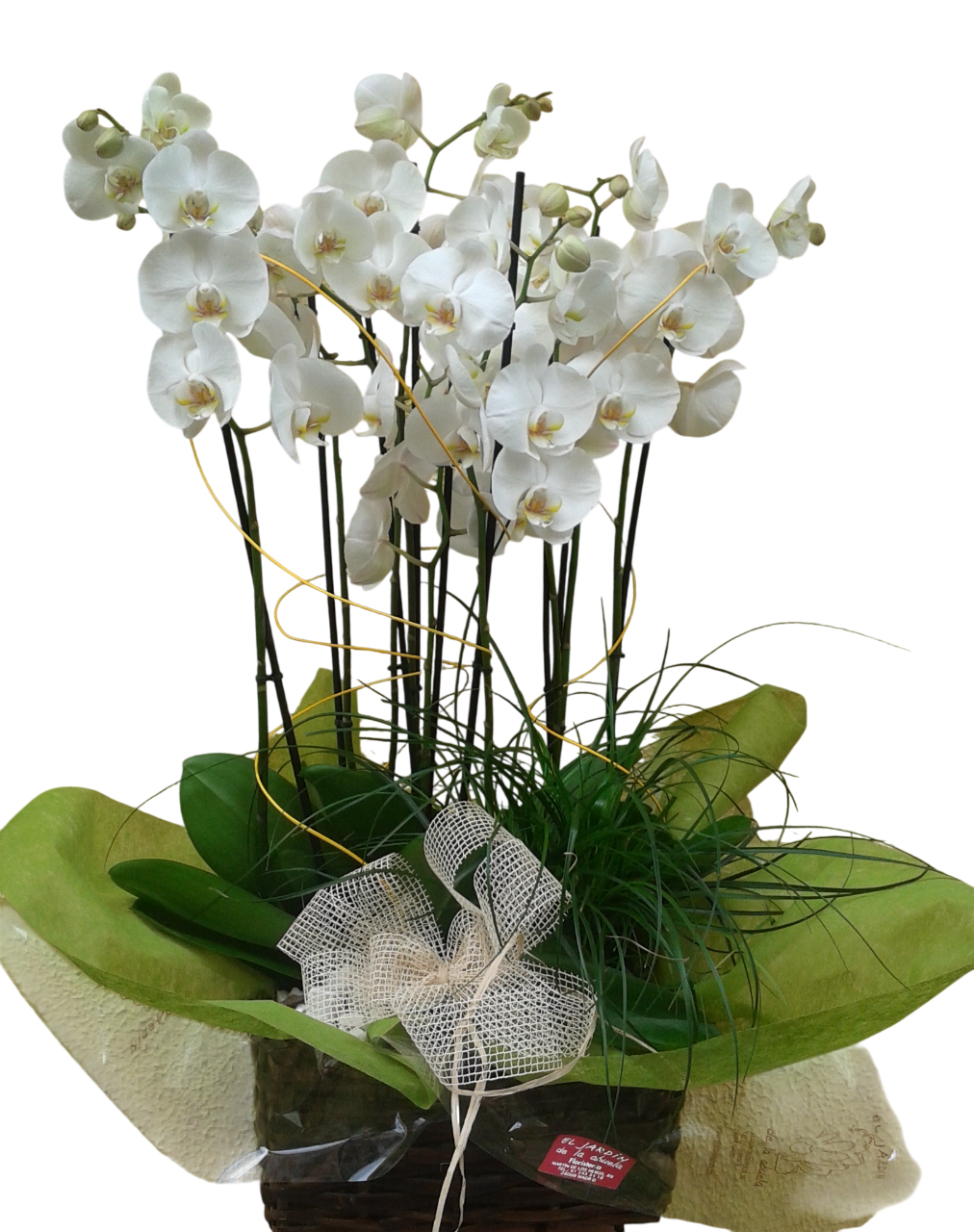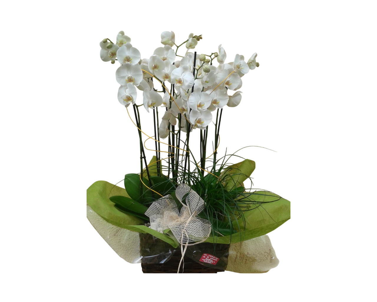 Conjunto formado por tres orquídeas dobles y una planta en la base, complementado por relleno de musgo natural y lazada de rafia o yute, todo en una cesta rústica de mimbre. Un bellísimo obsequio para bellísimas personas.