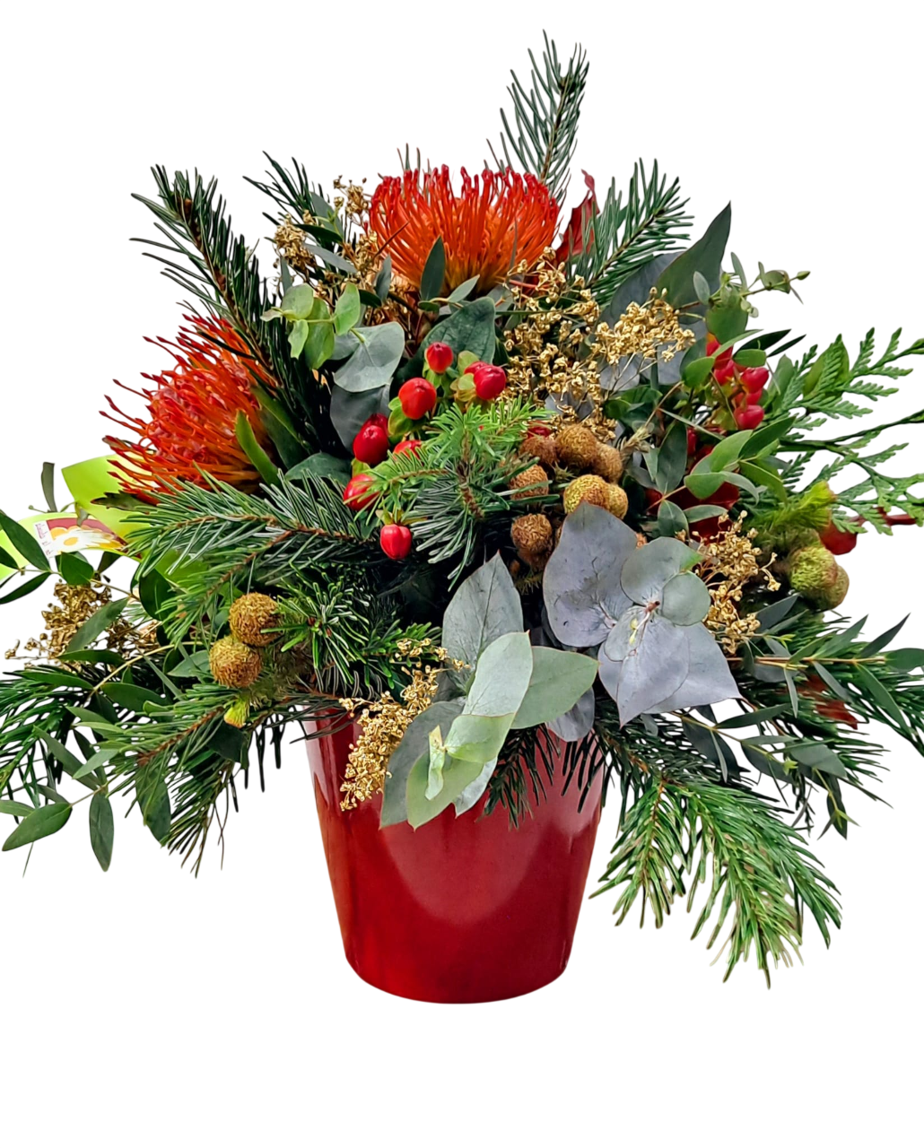 Precioso detalle de flores navideñas con tonos rojos, dorados, granates, verdes y cremas, montado en un macetero de cerámica. Ideal para colocar en la mesa y con flores de larga duración.