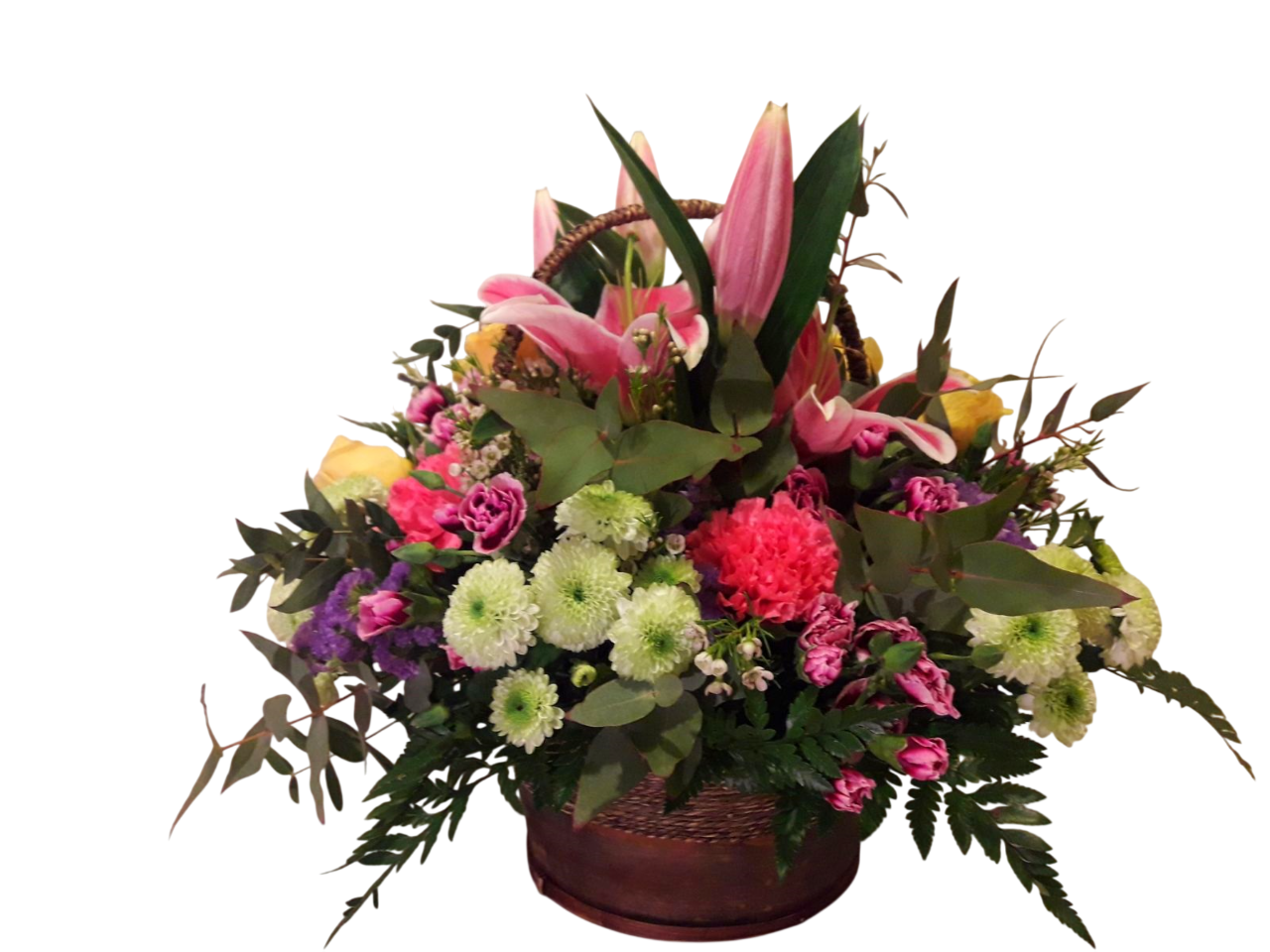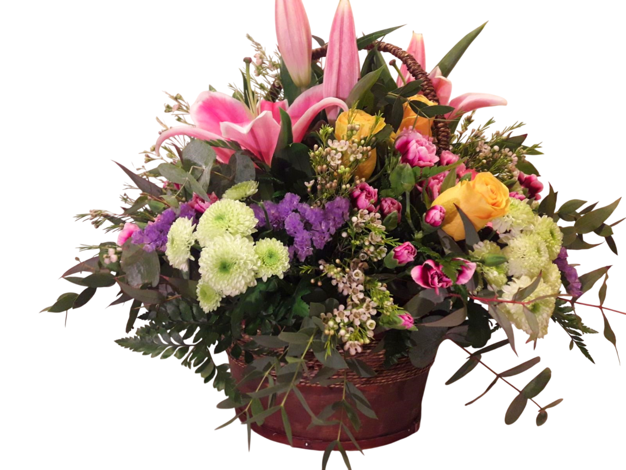 Compuesta por margaritas, azucenas, rosas, satatices, clavelinas, paniculata…y variedad de verdes colocados con profusión, montado sobre una cesta de mimbre o madera. Un regalo que transmite alegría y vitalidad.