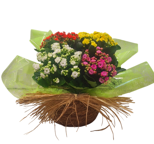 Cesta de yute compuesta por cuatro plantas de kalanchoe de colores