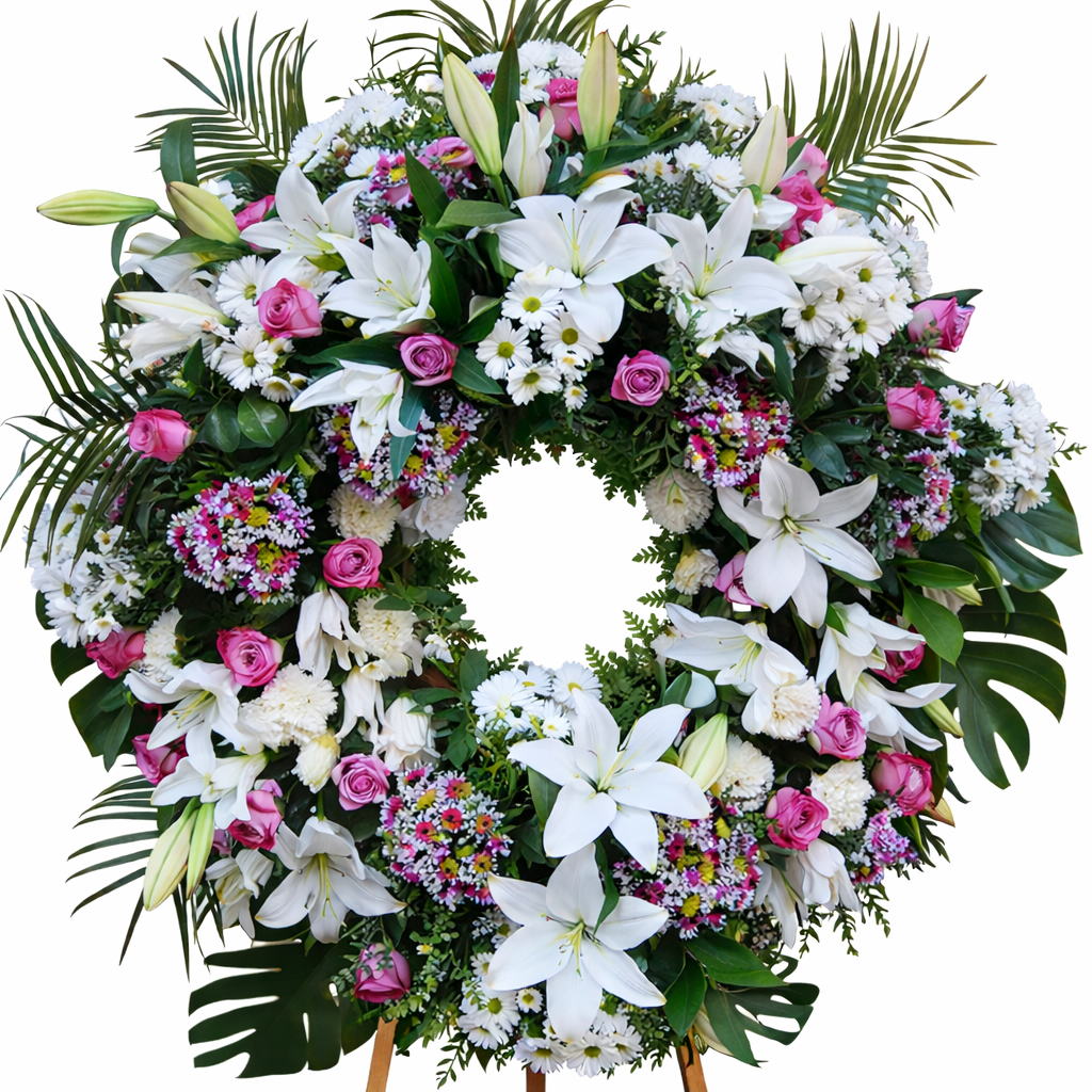 Margaritas, liliums, rosas, claveles, hojas y verdes decorativos