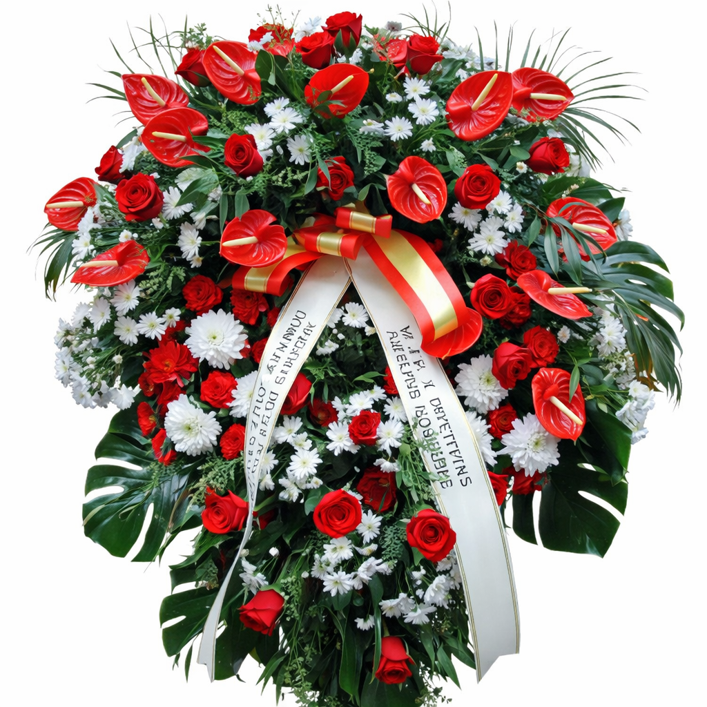 Margaritas, anthurium, crisantemos, rosas, hojas y verdes decorativos
