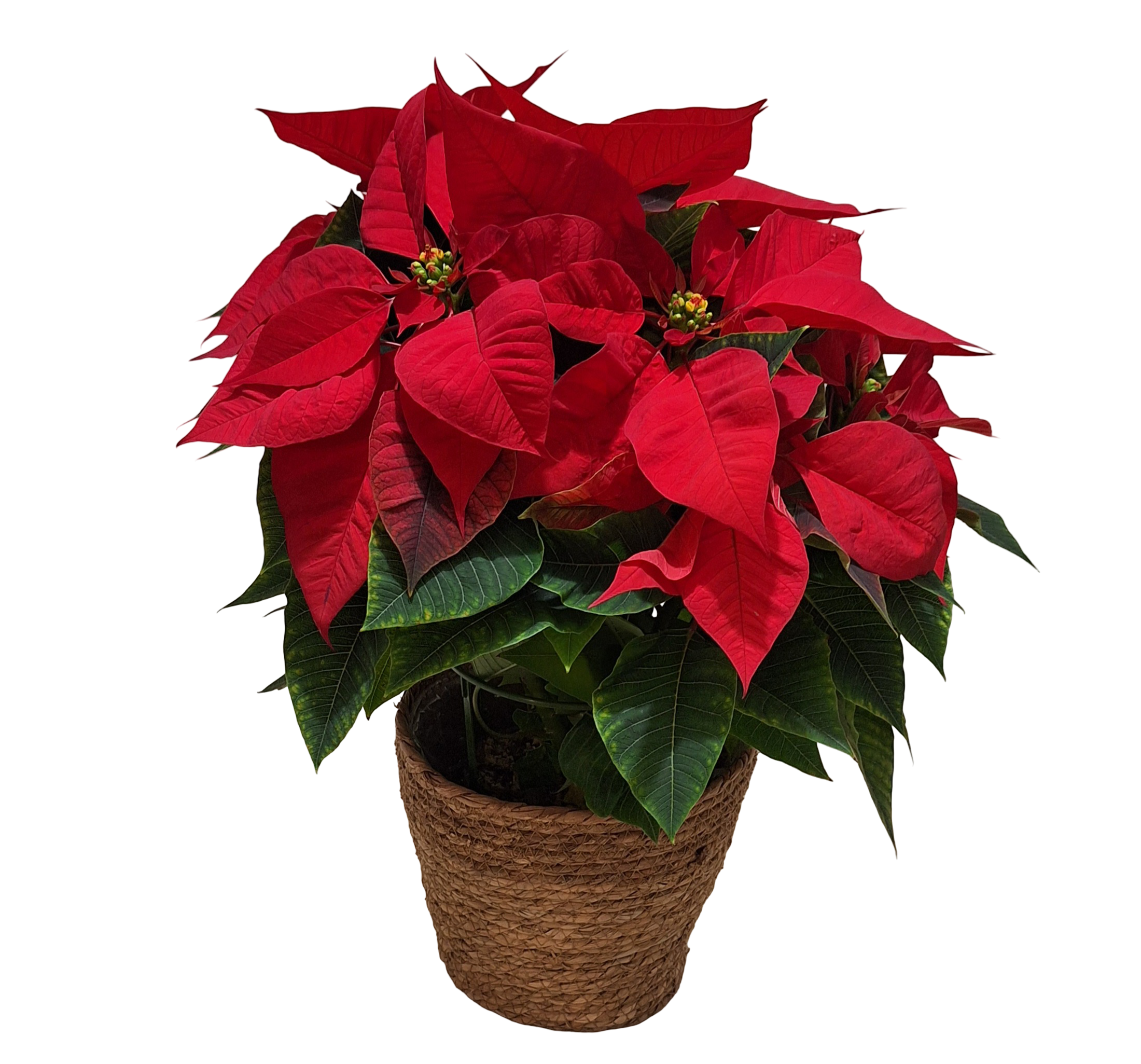 Precioso arreglo formado por una planta de flor de pascua colocada en maceta decorativa de yute , preparada con papel celofán y papel vegetal y adornada con un lazo de rafia. Un detalle bonito y sencillo para estas fiestas. Tamaño aproximado 45 cm alto x 40 cm diámetro.
