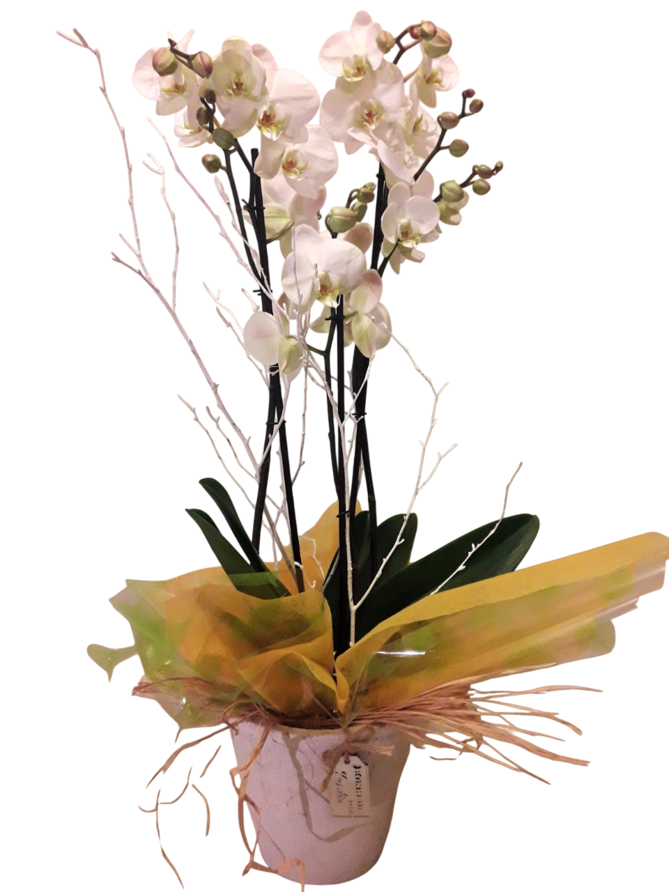 Orquídea phalaenopsis de dos a tres tallos preparada en un macetero de decorativo rústico, adornada con fibras y papel decorativo y ramaje de berksia. Un obsequio elegante y práctico, ya que la flor de la orquídea tiene una duración de dos a tres meses. Colores a elegir blanco, rosa o fucsia.