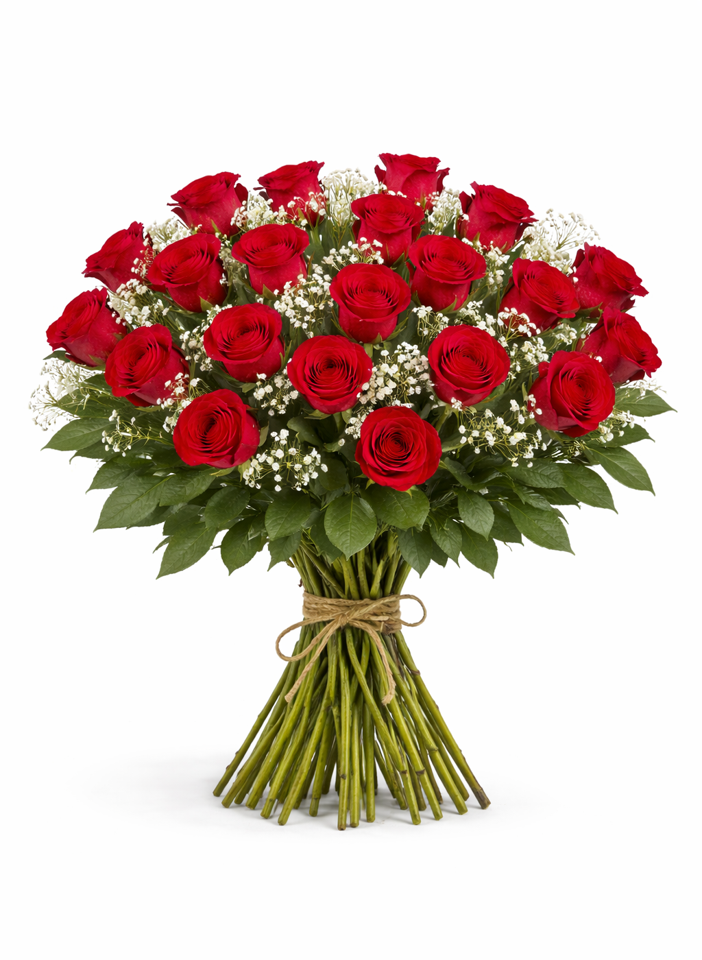 Precioso ramo de dos docenas de rosas largas( 70 cm ). Siempre frescas, las preparamos con variedad de rellenos verdes y con un envoltorio con agua incorporada, adornado con una lazada de raffia rústica.