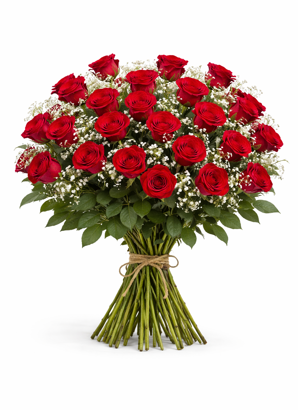 Precioso ramo de tres docenas de rosas largas( 70 cm ). Siempre frescas, las preparamos con variedad de rellenos verdes y con un envoltorio con agua incorporada, adornado con una lazada de raffia rústica.