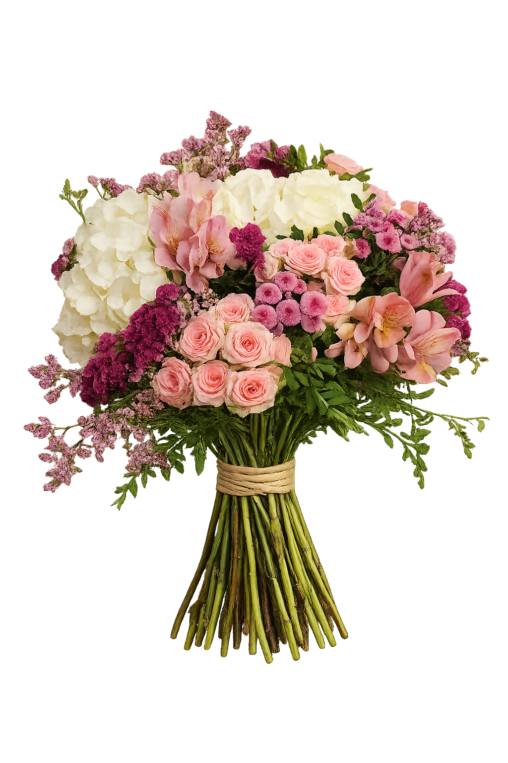 Este diseño se elabora cuidadosamente en nuestra floristería con flores frescas seleccionadas según temporada y disponibilidad. Puede incluir hortensias claras, rosas en distintos tamaños y flores decorativas que aportan contraste y movimiento al conjunto, manteniendo siempre la predominancia de la gama rosada.