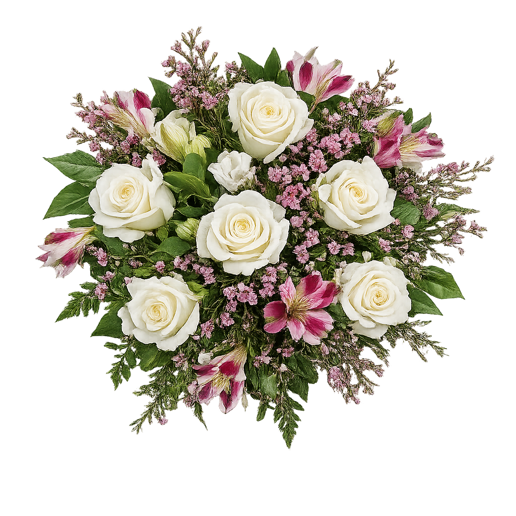 Este diseño floral se elabora cuidadosamente en nuestra floristería con flores seleccionadas según temporada y disponibilidad. Las rosas blancas aportan luminosidad y serenidad, mientras que las flores complementarias añaden contraste y dinamismo al conjunto, logrando un resultado sofisticado pero fresco al mismo tiempo.