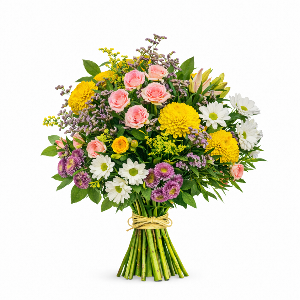 Ramo de flores variadas con rosas y flores de temporada, ideal para sorprender con un detalle alegre y lleno de vida.