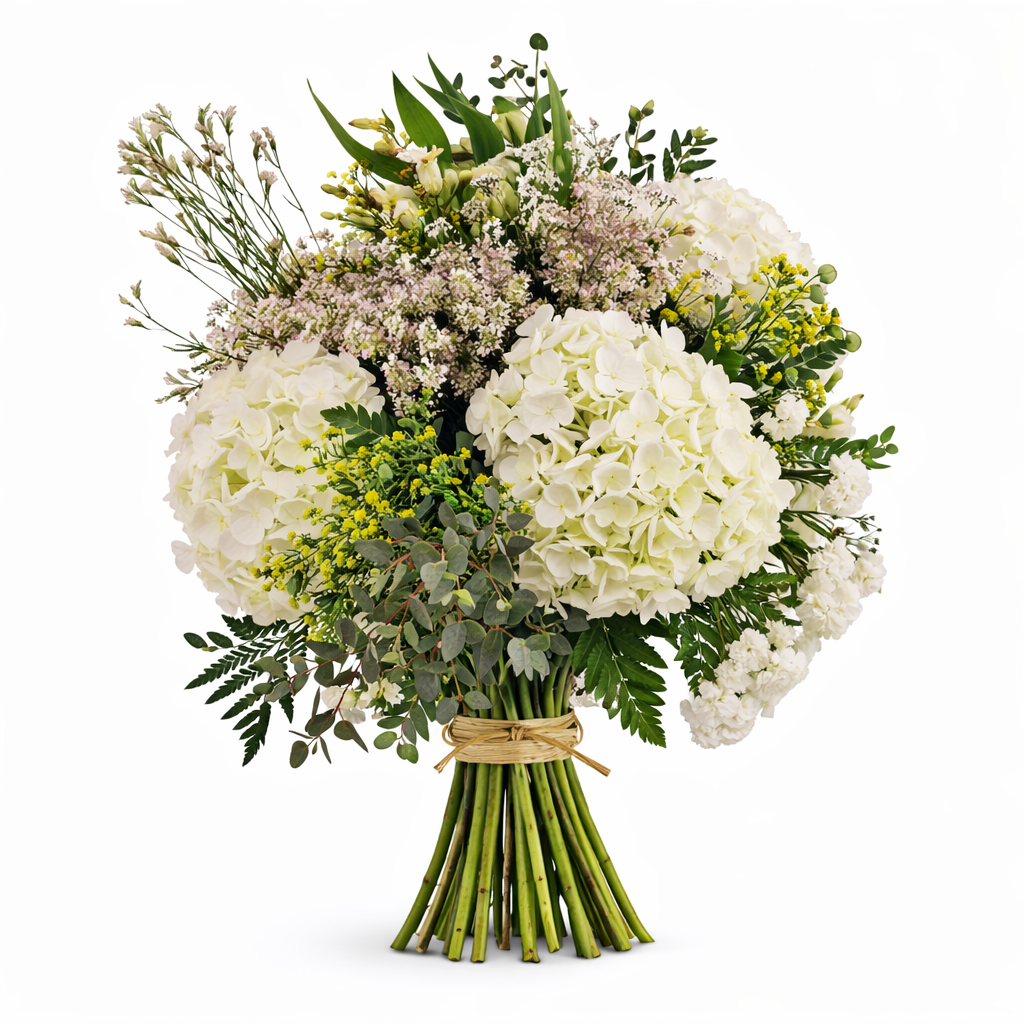 Este ramo de hortensias blancas se elabora con flores frescas seleccionadas cuidadosamente en nuestra floristería, combinadas con verdes decorativos que realzan su belleza y aportan equilibrio al conjunto. El resultado es una composición armoniosa, ideal tanto para regalar como para decorar el hogar o espacios profesionales.