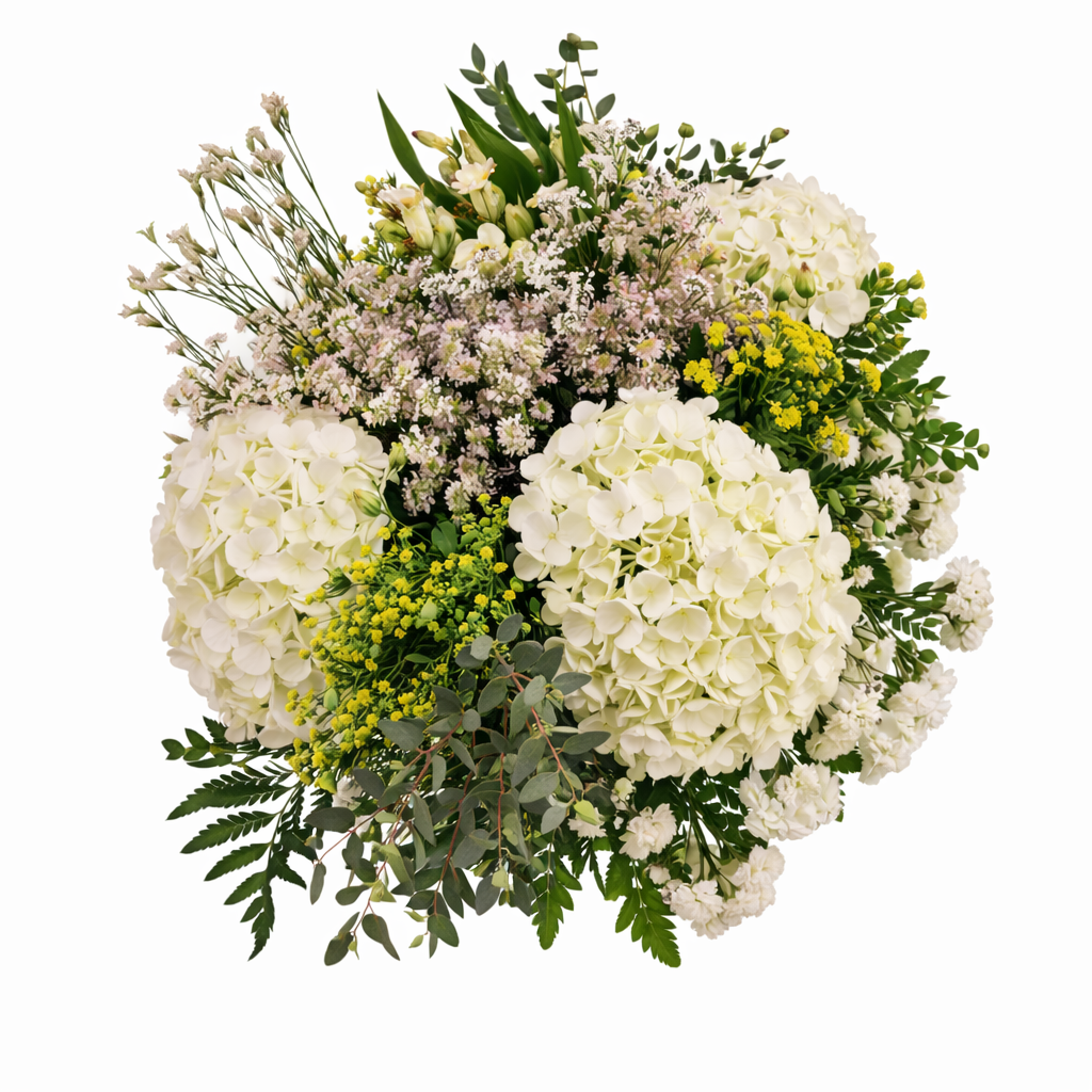 Ramo de hortensias blancas frescas con flores variadas y verde decorativo, ideal para aportar elegancia y luminosidad a cualquier espacio.