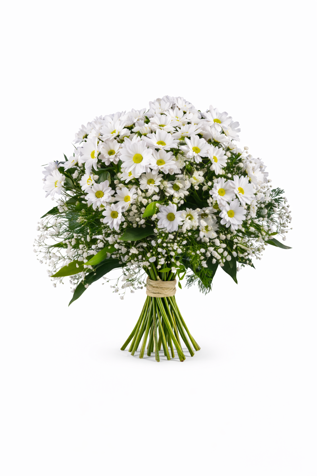 Este diseño se elabora en nuestra floristería con flores frescas seleccionadas cuidadosamente según disponibilidad. La combinación de margaritas con verdes decorativos y paniculata aporta volumen y textura, creando un conjunto equilibrado y armonioso que transmite ligereza y naturalidad.