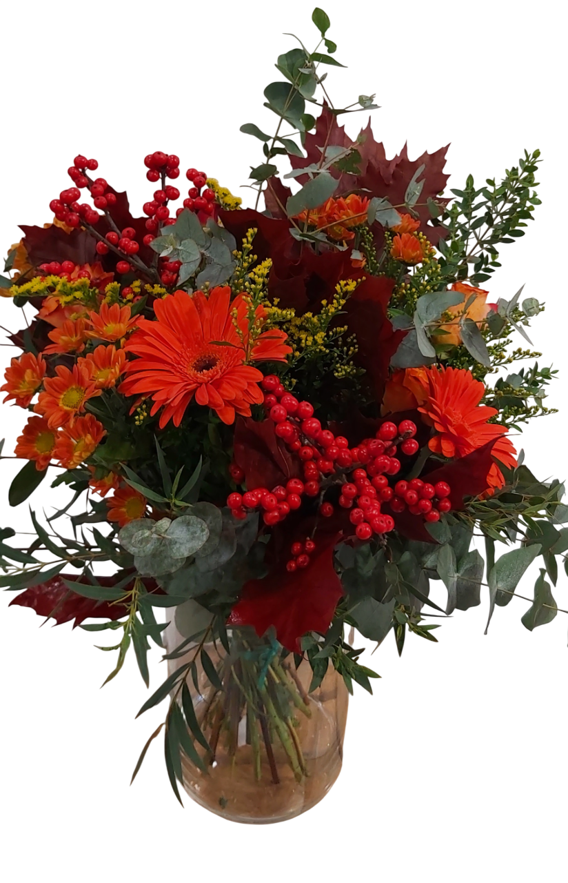 Composición de flores variadas en ramo combinadas con adornos navideños y flores decoradas en dorados, ocres, granates…Precioso, original y fresco, va envuelto en papel transparente con agua incorporada, y atado con lazada de rafia.