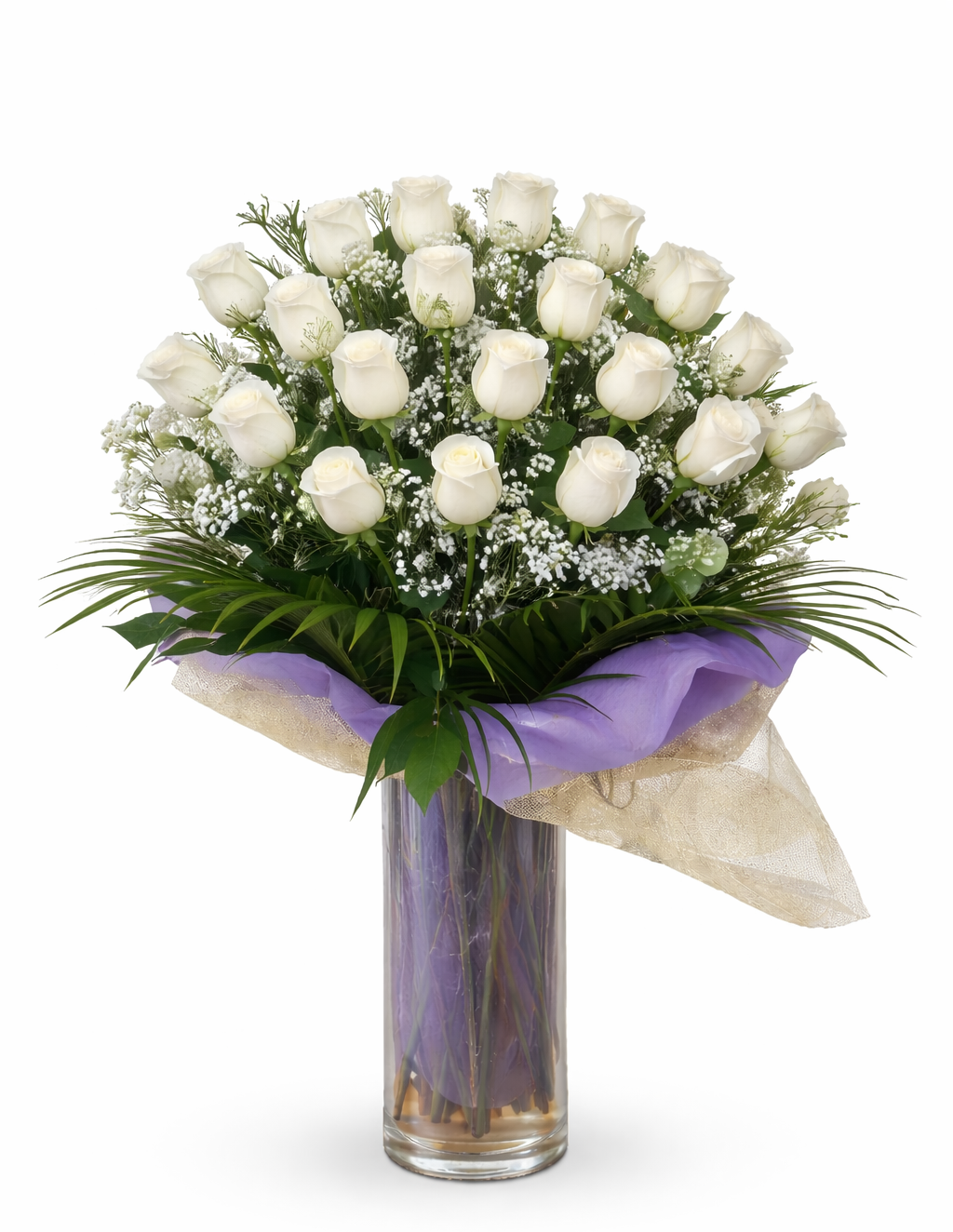 Elegante ramo de rosas largas en jarrón de cristal, complementadas con verdes y hojas decorativas.