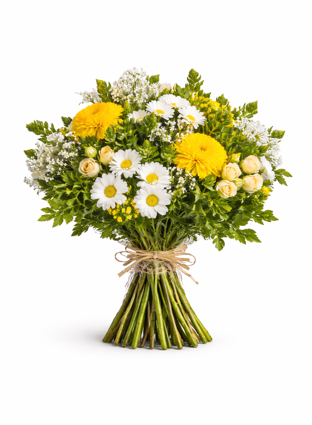 Este ramo de flores en tonos blancos y amarillos está confeccionado con una selección equilibrada de flores. Incluye margaritas, gerberas, rosas spray, paniculata y verdes decorativos. Cada elemento se combina con cuidado para lograr un conjunto armonioso y natural.