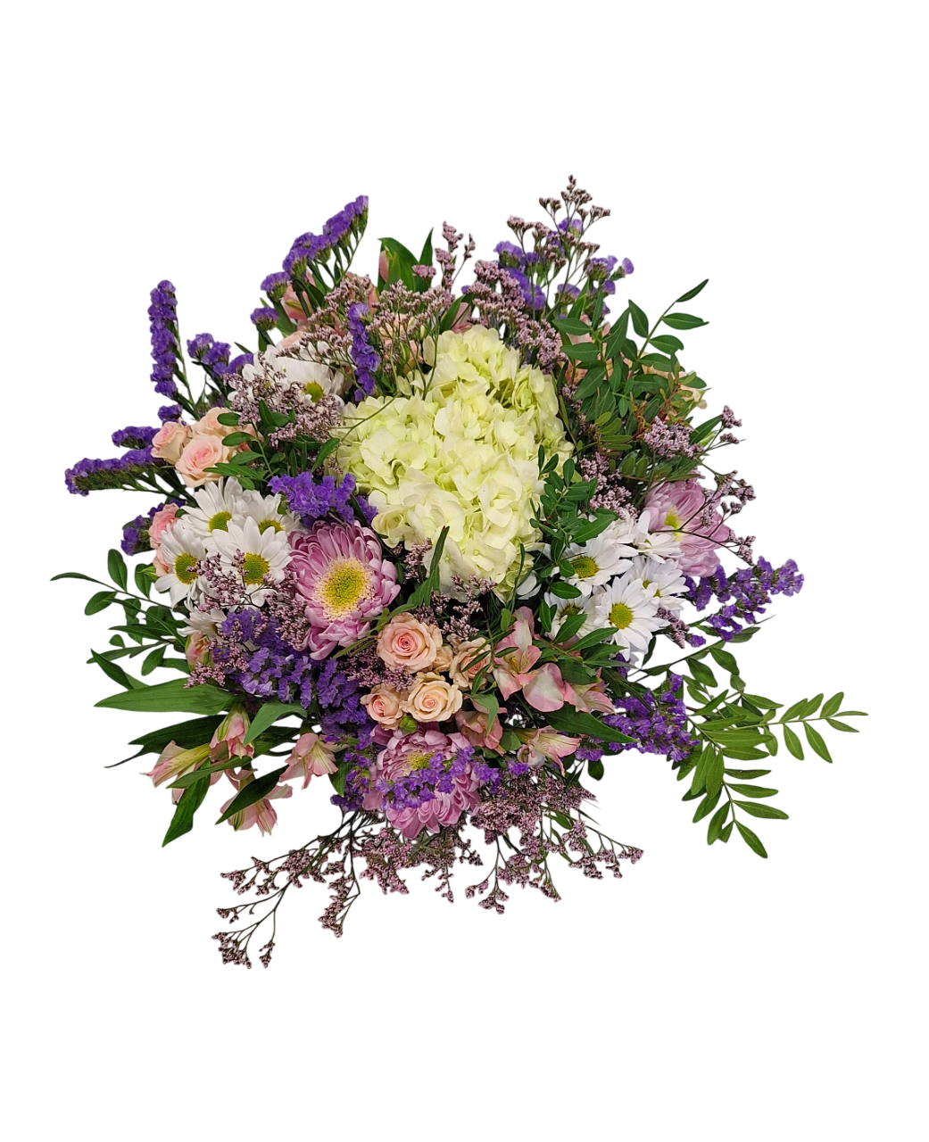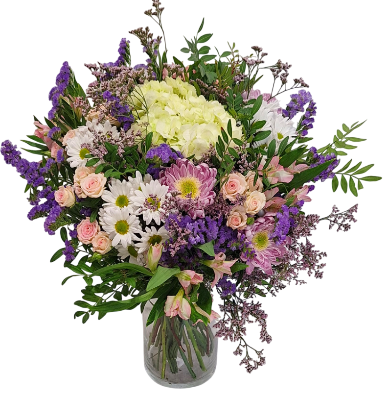 Original bouquet de flores con tonos blancos, rosas y malvas, con rosas, anastasias, limonium, hortesnsias, siemprevivas, margaritas eucalipto, madroño…Lo preparamos con papeles celofanes en envoltorio con agua incorporada, y adornado con lazo de rafia.