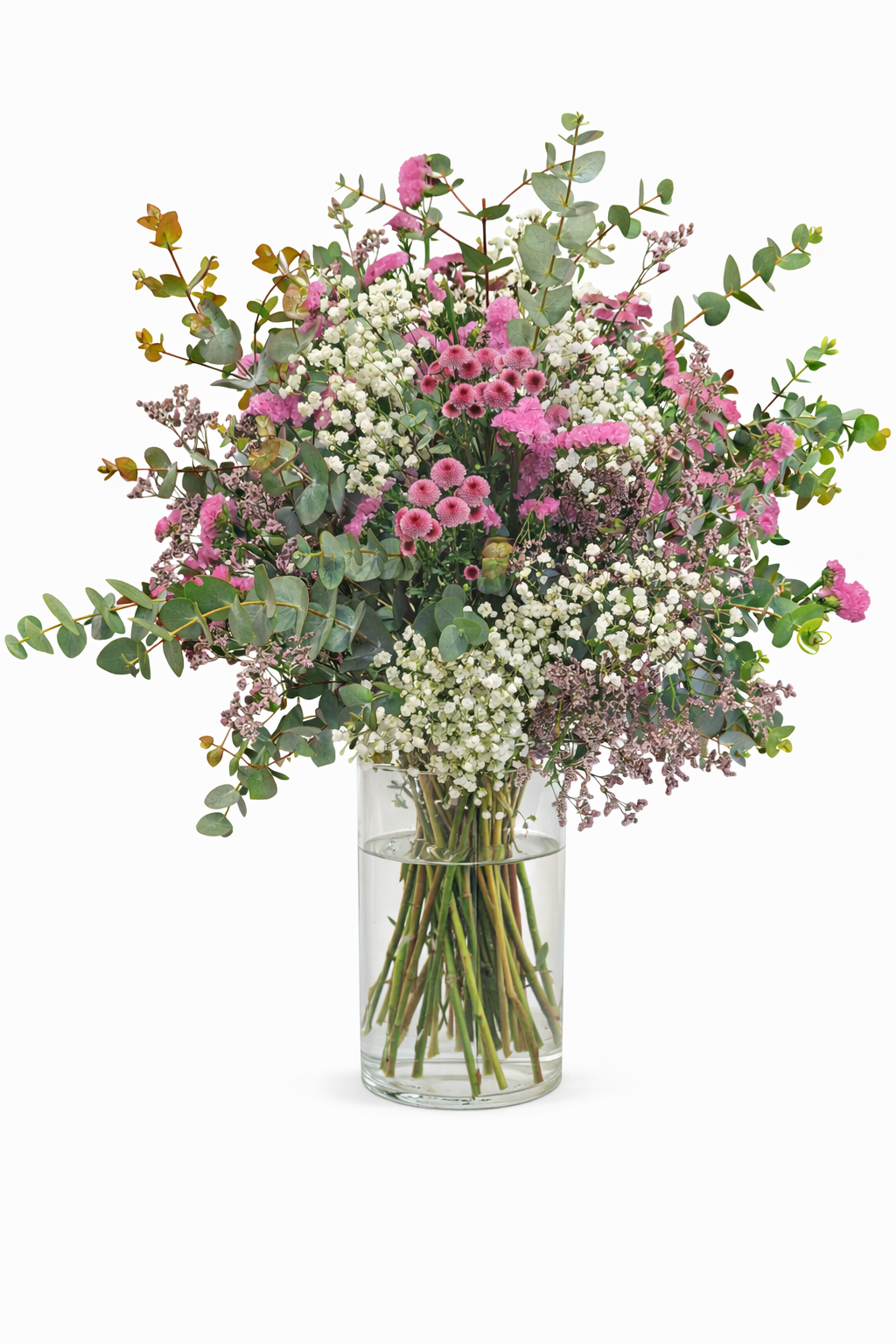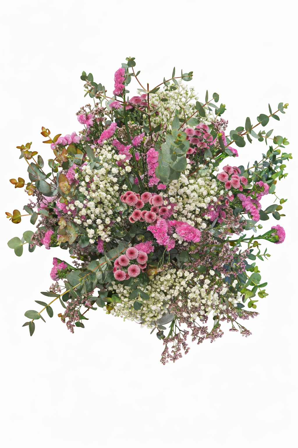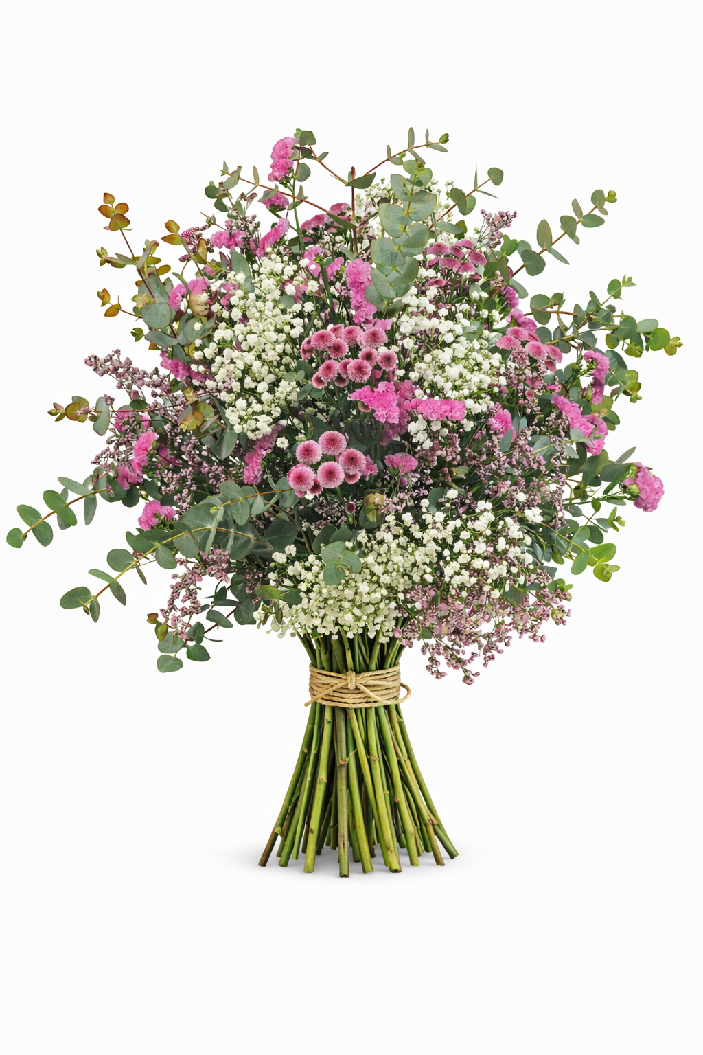 Precioso ramo que puedes secar y mantener varios meses decorando en casa. Compuesto por siemprevivas, limonium de colores blancos y rosas, paniculata, santini y eucalipto, todas esta variedades de flores se pueden preservar y mantener durante mucho tiempo.