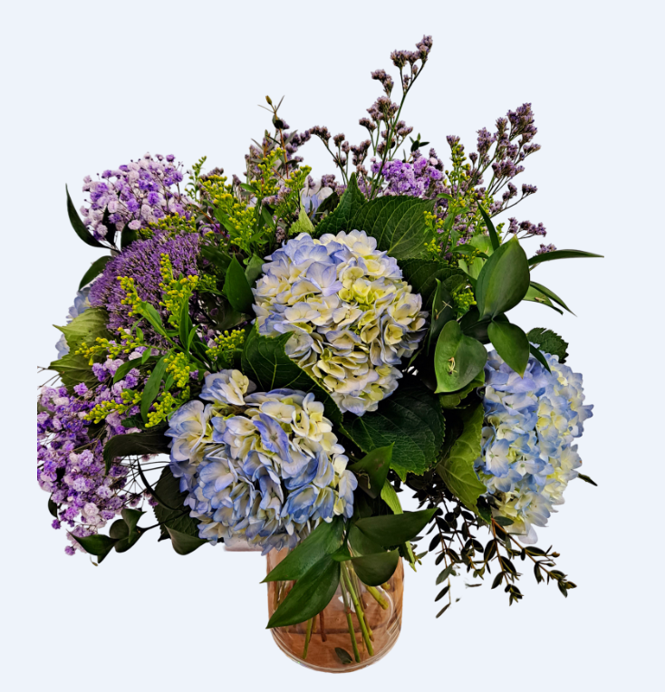 Dulce bouquet compuesto por hortensias, tratchelum, paniculatas y limonium, solidago, ruscus y eucalipto,